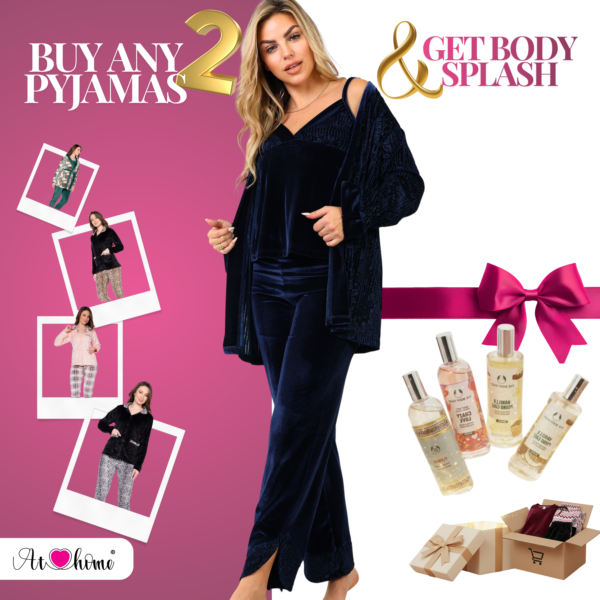 This pajama set offers the perfect blend of warmth and elegance for chilly winter days. Made from premium velvet fabric, it features an exceptionally soft and cozy texture, ensuring both comfort and luxury. Available in four sizes (M, L, XL, 2XL) and a variety of attractive colors with modern designs from the **At Home** winter collection, it’s designed to suit your taste and add a touch of sophistication to your homewear style.